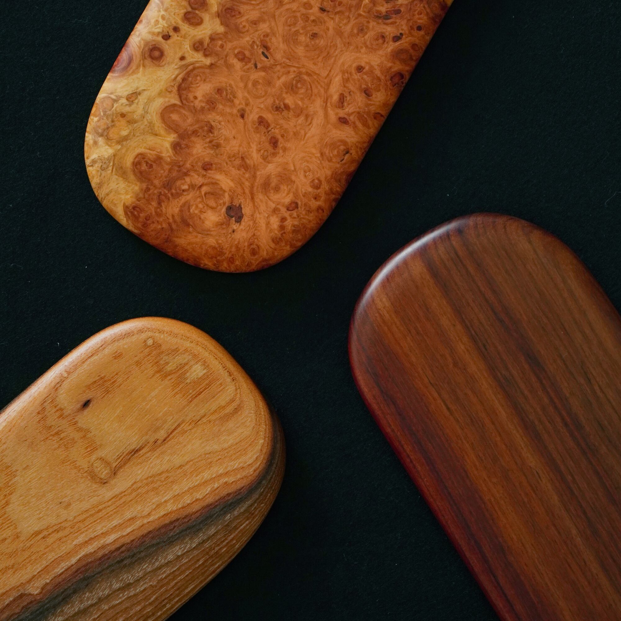 長期間に渡り自然乾燥された木材のみを厳選し、銘木の材質や模様に合わせてひとつひとつ丁寧に磨きあげています。研磨後はシリカを主原料とした撥水性や防水性のあるセラミック塗料で複数回浸透と乾燥を繰り返し、蜜蝋ワックスで仕上げております。すべて食品安全基準試験をクリアした塗料を使用。木材の加工のため研磨時の細かなキズ跡が残る場合がありますがご了承ください。